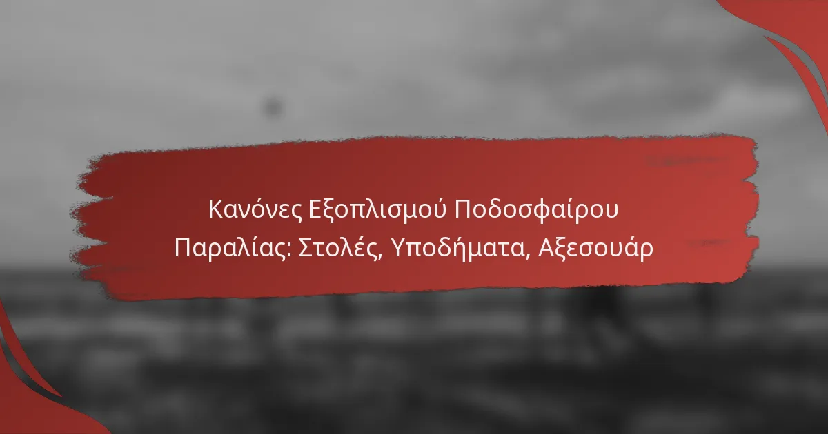 Ο εξοπλισμός του ποδοσφαίρου παραλίας διέπεται από συγκεκριμένους κανόνες που καλύπτουν τις στολές, τα υποδήματα και τα αξεσουάρ για να εξασφαλίσουν μια επαγγελματική εμφάνιση και την ασφάλεια των παικτών. Οι στολές πρέπει να τηρούν κανονισμούς σχετικά με το σχεδιασμό και την επωνυμία, ενώ οι επιλογές υποδημάτων μπορεί να ποικίλλουν μεταξύ εξειδικευμένων παπουτσιών και παιχνιδιού ξυπόλητοι. Επιπλέον, οι παίκτες επιτρέπεται να φορούν ορισμένα αξεσουάρ που ενισχύουν την απόδοση, εφόσον συμμορφώνονται με τα πρότυπα ασφαλείας για να διατηρηθεί η δίκαιη παιγνίδι.